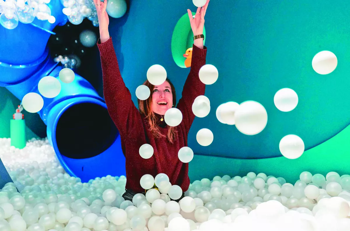 博物館創辦人格魯比奇,在一個置滿小白球的球池中玩樂。圖/法新社