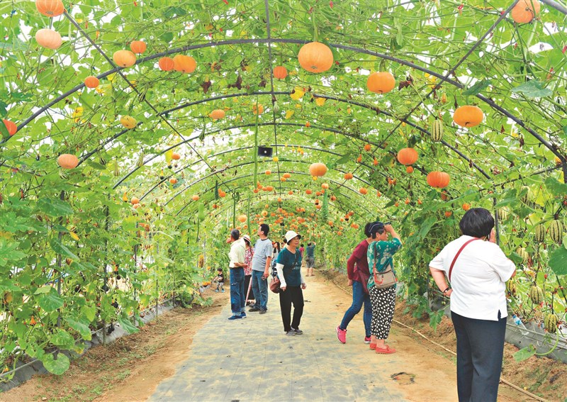 造橋南瓜季的「南瓜隧道」,棚架上種植各種南瓜。 圖/苗栗縣政府提供