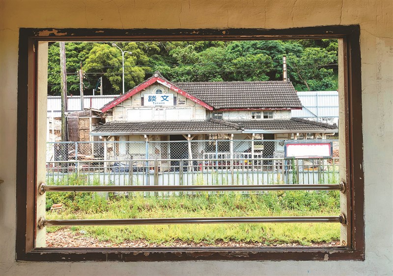 談文車站是苗栗縣歷史建築,從候車亭景觀窗中,可以看見「海線五寶」之一的老火車站。圖/人間社記者王麒瑋