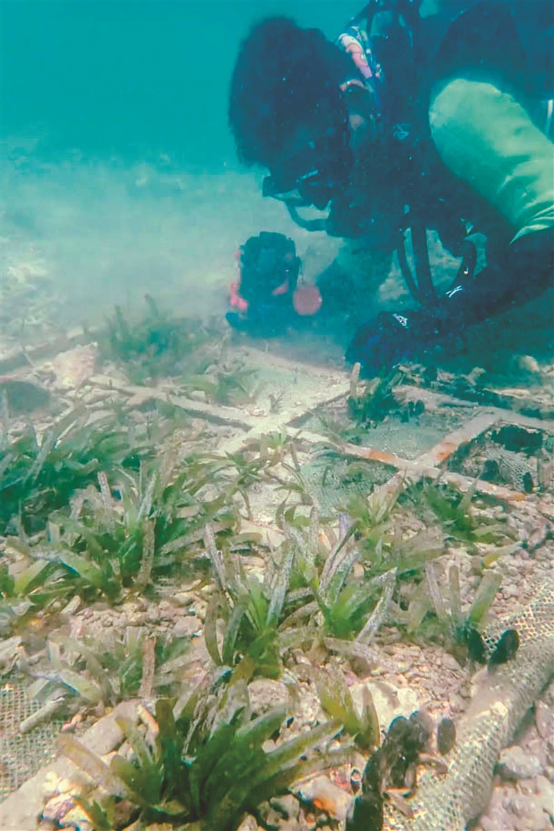 陳石泉團隊採「海底土方格」技術,固定海草草苗。圖/取自人民網
