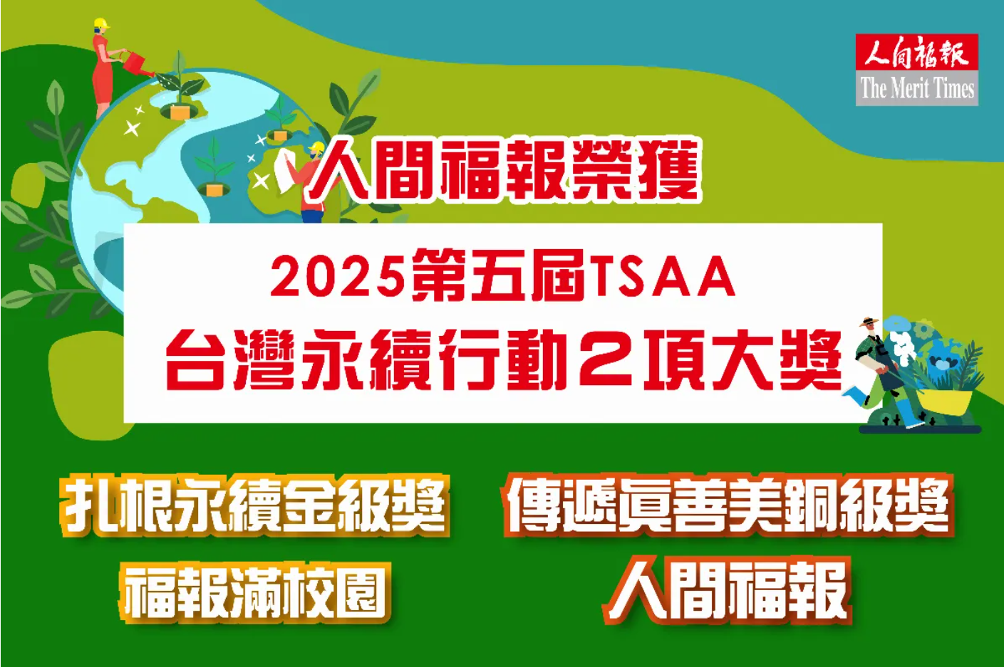 【記者曾博群台北報導】《人間福報》在推動社會共融與永續理念上再創佳績,於 2025 第五屆「TSAA 台灣永續行動獎」中一舉摘下兩項殊榮:「SDG4 讀報扎根 傳遞永續」金級獎,以及「SDG10 人間福報 傳遞真善美」銅級獎,展現媒體在教育推廣與社會關懷上的深厚影響力。