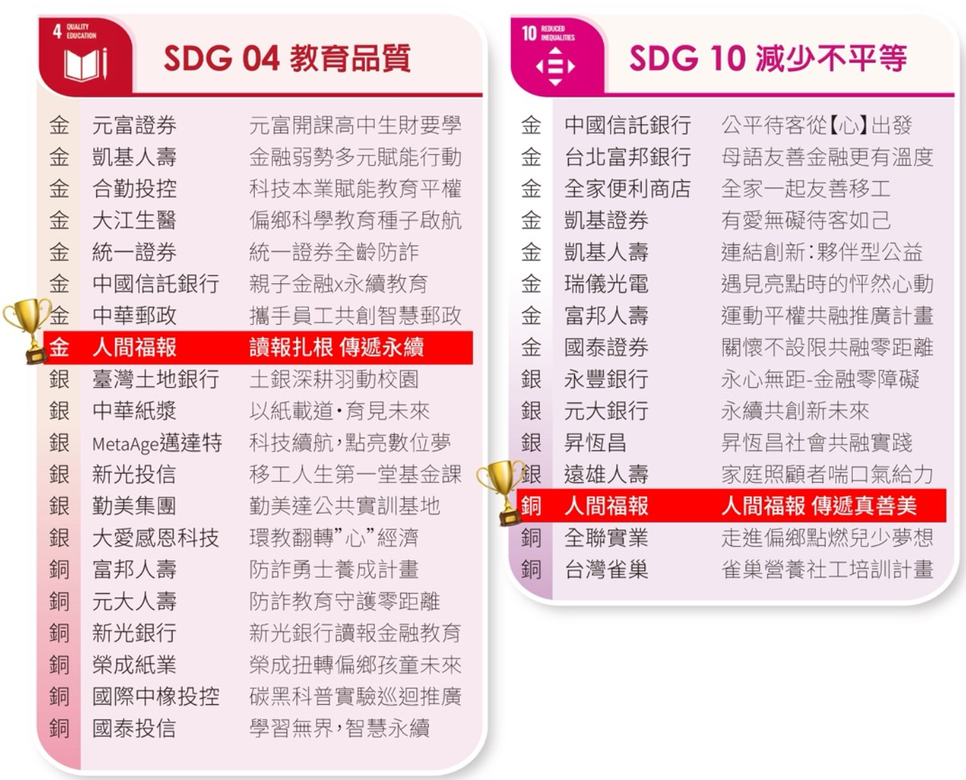 《人間福報》在推動社會共融與永續理念上再創佳績,於 2025 第五屆「TSAA 台灣永續行動獎」中一舉摘下兩項殊榮:「SDG4 讀報扎根 傳遞永續」金級獎,以及「SDG10 人間福報 傳遞真善美」銅級獎,展現媒體在教育推廣與社會關懷上的深厚影響力。圖/人間福報數位部製圖