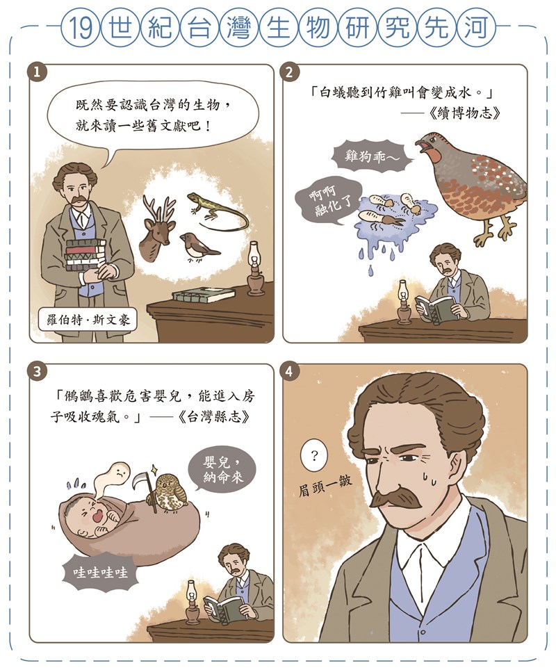 面對未知事物,想找資料學習是很自然的事,為了更了解台灣生物的習性,斯文豪也試圖閱讀、翻譯中文古籍,然而中文古籍的專長或許不在生物觀察文中,生物常自帶光怪陸離的傳說色彩: