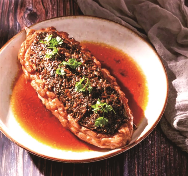 因為是從葷轉素的飲食者,嚴心鏞特別鑽研要怎麼用梅乾、麻油、酸菜等元素,在無肉情況下,燒出記憶中的味道。如今植物肉技術已大幅進步,豆腥味也改善許多,但因為可用的蔬食食材仍有限,要做出熟悉的味型,往往得經過反覆實驗與替代測試,「雖然只是蔬菜入菜的概念,但背後其實藏著很多眉角需要調整。」