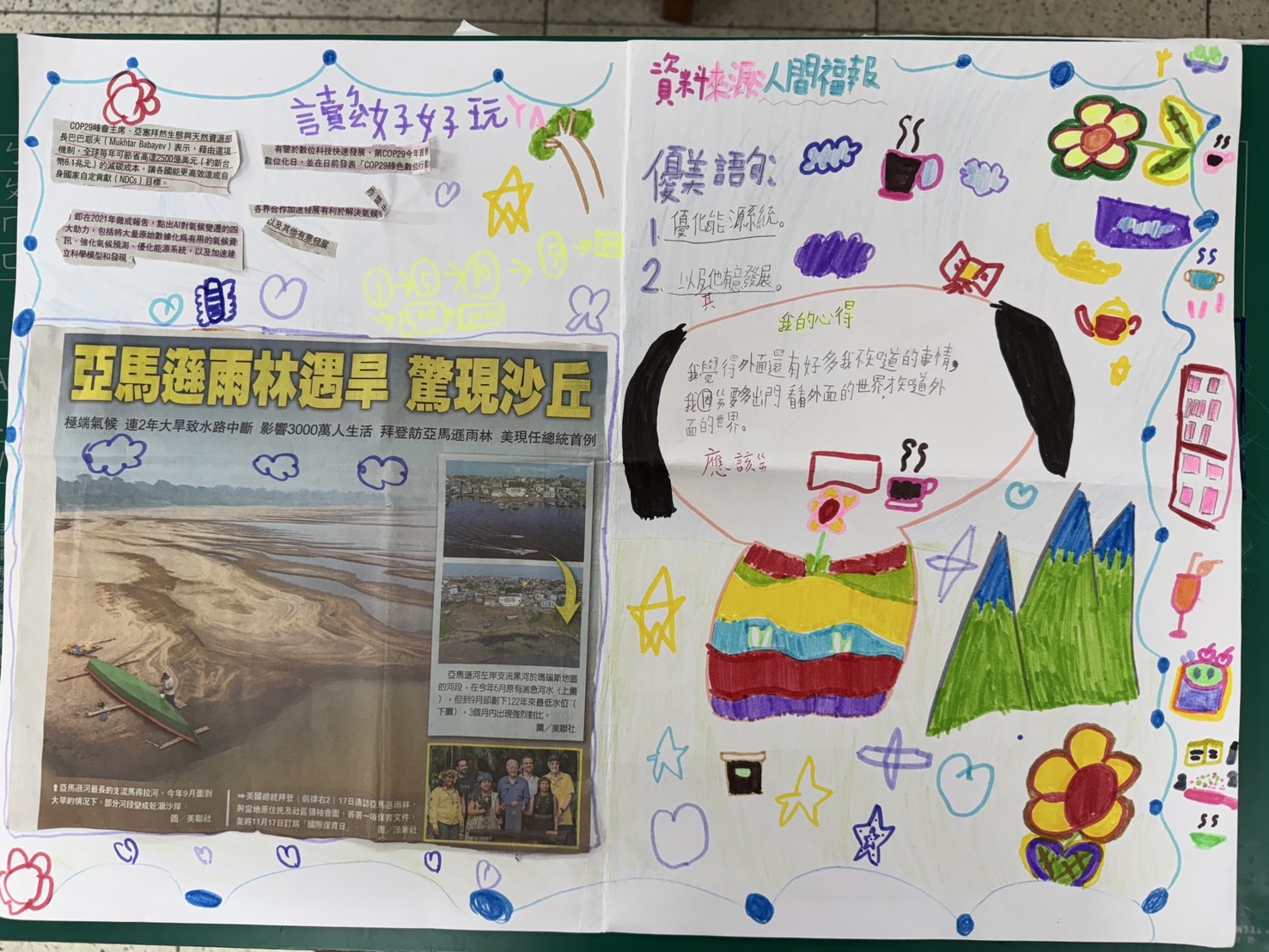 看到大家認真讀報紙,找尋自己有興趣的主題,真是一幕美麗的課堂風景。學生練習剪報,製作讀報心得,再上台分享介紹優良作品,在優良作品展示與學習中,孩子便多開啟了一道視窗。