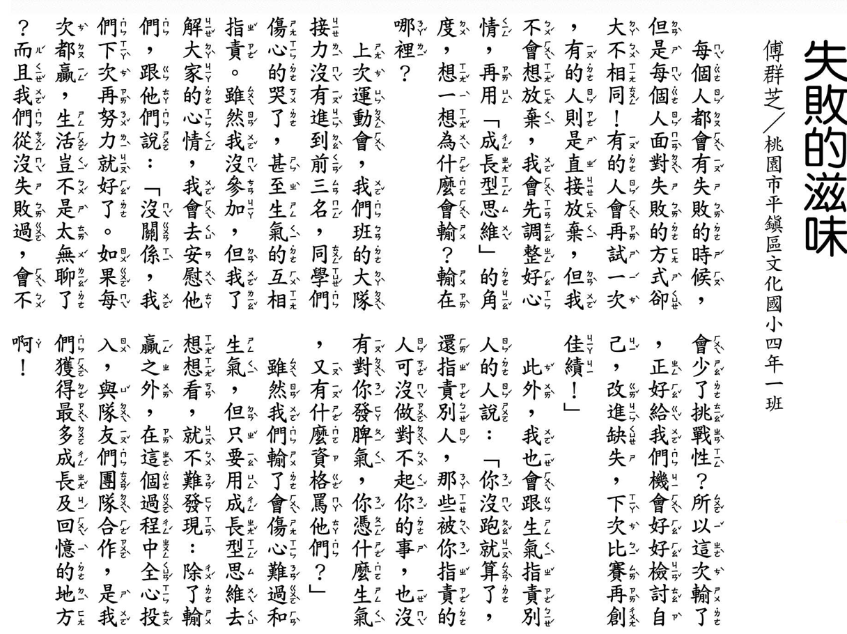 比賽結束後,我們坐在休息區,我想著:「這次的失敗不能怪罪任何人,大家都已經盡力了……」這時,輕柔又小聲的聲音從我嘴中說出:「抱歉,是因為我的關係才害全班變成了第二名,都是因為我……」當大家聽到這些話時,紛紛跑過來說:「沒關係,這並不是你的錯,而且第二名也很好喔!」頓時,我感受到了大家的同學愛,比較不那麼自責了——「這就是失敗的滋味嗎?」我這麼想。