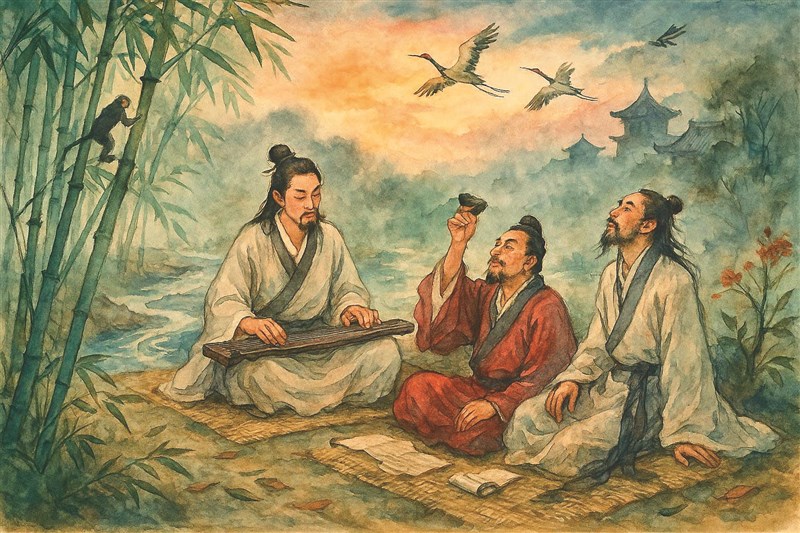 魏晉名士活在政治傾軋、高死亡率的專制年代,竹林七賢看似荒誕的行為,實以生命挑戰政治化的禮教、虛偽的人際枷鎖,也只是渴望苟全性命於亂世,忠於自己、活出自己。