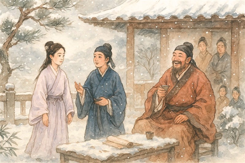 這場嚴雪中的即興創作,作為長輩的謝安只是「大笑樂」,沒有評價,也沒有優劣的指陳;勝負高低只是會心一笑,益見瀟灑逸趣,也見「風流名相」體貼晚輩成長過程的氣度。