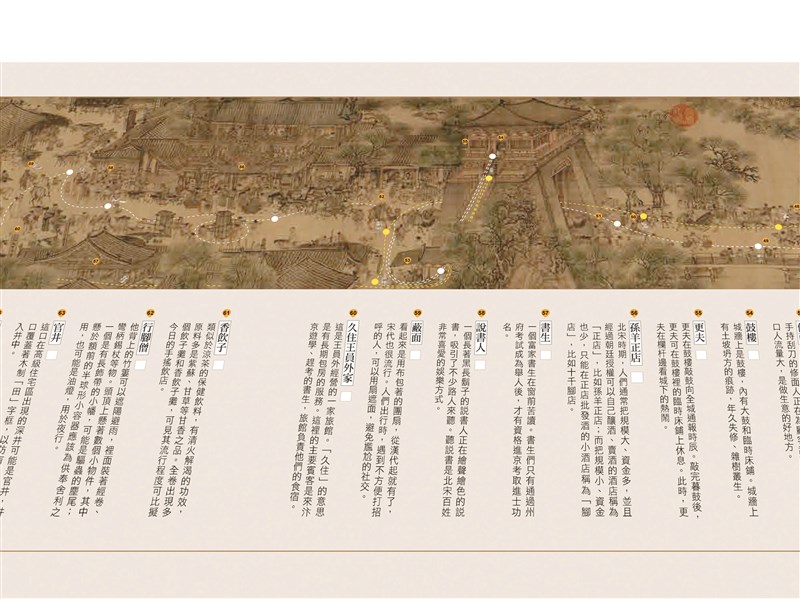 郁蓉的演繹為戴芸的故事注入了靈魂。她不僅是單純的配圖,更透過裝幀結構和繪畫技法,實現了對〈清明上河圖〉形與神的再造。長卷、風琴褶設計,還原了古代手卷畫「緩緩展開、細細品味」的儀式感。繪本完全展開長度可達近七公尺,給予讀者的視覺衝擊力,遠超過一般書籍的平面感。長卷形成一連續不斷的畫面,彷彿一條路徑,會讓讀者意識到不是在看一個故事,而是「走進」一個世界。