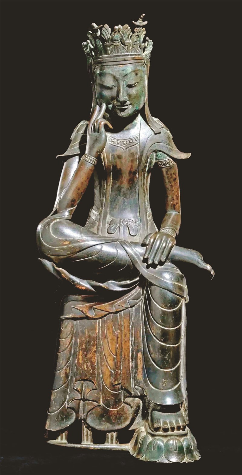 「半跏思惟像」的起源可追溯至西元二至三世紀的印度西北犍陀羅地區,在中土則大盛於南北朝時期,成為中國佛教藝術中極具象徵意涵的重要造型,而思惟造像主角多為悉達多太子或彌勒菩薩,顯現佛菩薩在禪定中思索宇宙真理、眾生苦難。半跏思惟由兩個核心元素組成,一是「思惟相」,一手托腮、一手扶膝,頭微側,神情凝思,表現深入禪觀、觀照諸法無常之態;二是「半跏坐」,一足自然垂下,另一足曲盤於膝上,體現輕鬆、灑脫、不拘俗禮的坐姿。