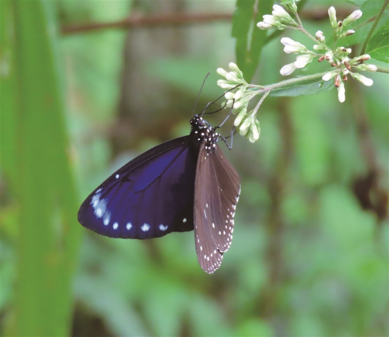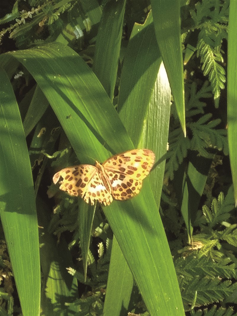 此時黑鳳蝶緩緩穿梭在燦美的月季花叢中,飛累了的細帶環蛺蝶﹙台灣三線蝶﹚停在欄杆上小歇,那靜靜徘徊在樹蔭下的是豹紋蝶。每年九月後,紫斑蝶開始南飛過冬,但花園中總有幾隻紫斑蝶仍流連於高士佛澤蘭的花香裡,無視歸期,牠們就愛那素白無奇的高士佛澤蘭,但若在第一道寒流來襲之前無法南返避冬,牠們將可能因之而凍死。