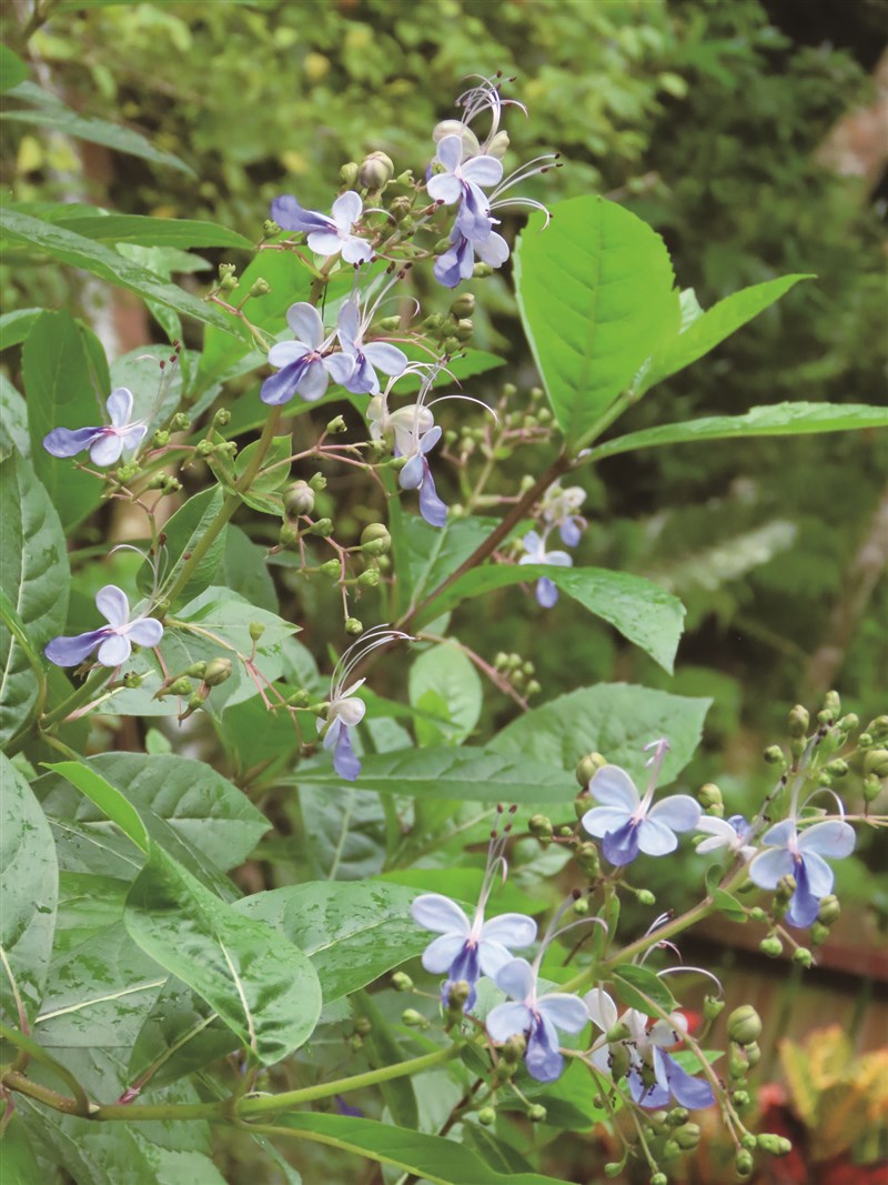 庭園正中間種了一棵美麗的植物,我時常望著那由聚繖花序組成的圓錐花序,花朵伸出於枝端,花冠五裂,左右兩對淺藍色裂片宛如蝴蝶雙翅,下裂片呈深藍色似蝶身,四條細長彎曲的花絲猶似蝴蝶觸鬚,花形像極了蝴蝶,而它的名字就叫「藍蝴蝶」。每當微風吹來,枝葉搖曳時,群聚枝頭的藍蝴蝶,彷彿拍著翅膀望向藍天,這時總錯覺它們就要飛走了──此生為花,靈魂是蝶,披著藍色羽衣,時時想飛,卻被枝頭牽絆,只能惆悵徒擁蝴蝶之名啊!