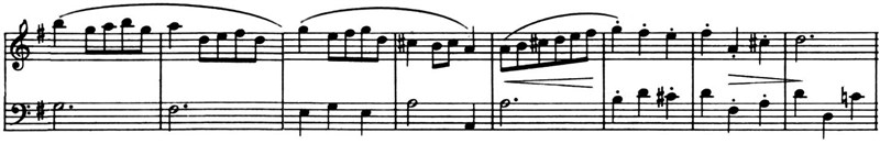 巴洛克時代的小步舞曲通常是3/4拍的A、B二段體,兩段各自反覆一次;A段從主調開始,結束於屬調,B段則從屬調展開,然後回到主調結束;樂曲速度中庸偏慢,保持小步舞曲原有的優雅風格。下面是〈巴哈G大調小步舞曲〉的A、B段譜例,A段從G大調開始,B段轉入D大調: