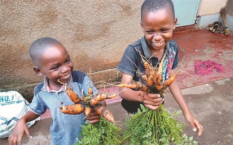 烏干達 種菜學新知 在烏干達卡尼亞尼亞校園小菜園裡,孩童親手耕作收穫蔬菜,臉上綻放燦爛笑容。 圖/取自Kichini Gardeners基金會