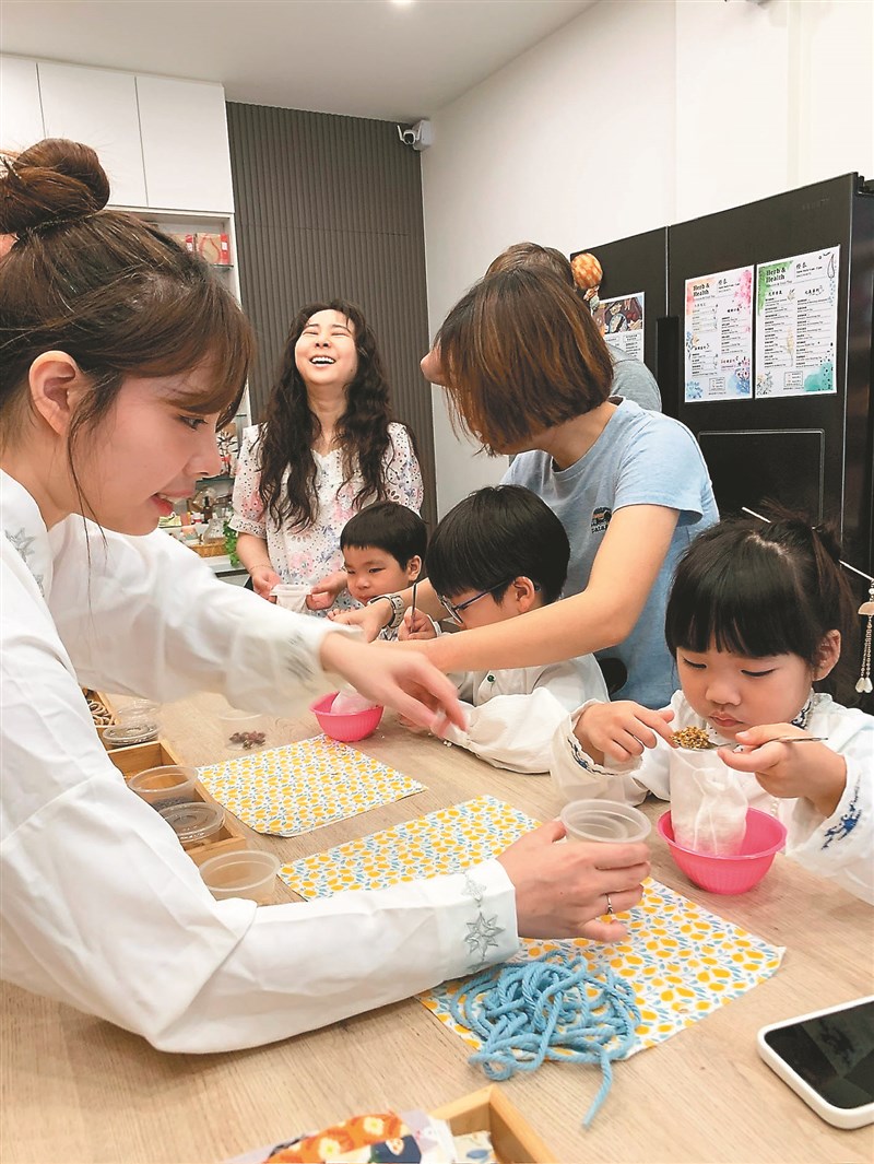 彭語柔(左1)推出捶捶棒DIY課程,親子動手樂在其中。圖/橙泰蔘藥行提供