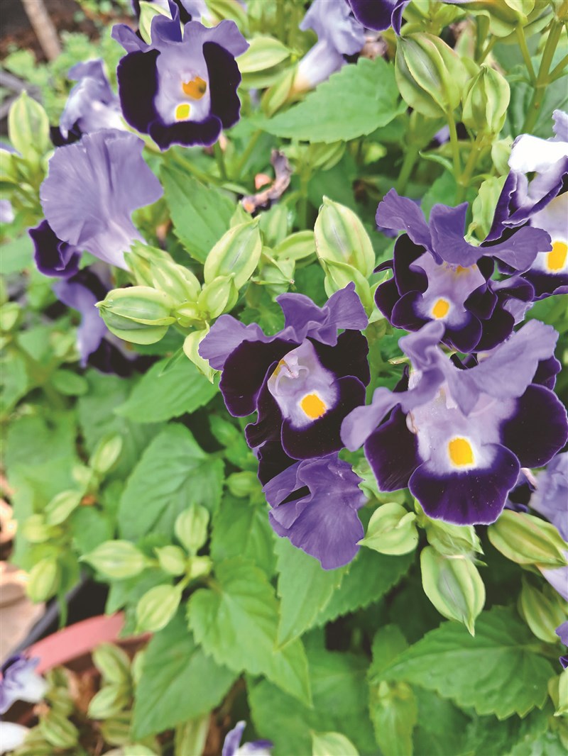 藍色品種也變了。有的仍開出去年的白底藍邊,乾淨典雅、沉靜平和,讓人安定;然而另一盆,卻在藍底的花緣生出深藍的絨毛滾邊,如畫師筆下的暈染,是夜空撫過清晨後留下的痕跡。