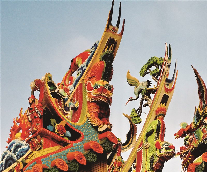 我還是最喜歡登上最頂樓,俯瞰腳底下重簷燕背上各色的剪黏。那些色彩華麗,大紅大綠又青又黃的飛龍、祥鳳、白鶴、憨獅、卷草花卉,以及表情身姿各異的仙人,總讓我覺得特別親切。