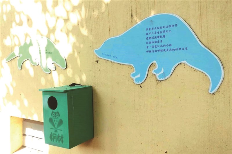 桐林豐富的自然生態為我帶來源源不絕的靈感,我以野生動物為主題創作的小詩,絕大多數跟這座山有關,這些「獻給動物朋友的詩」有的先爬上了動物繪本的封底或扉頁,有的則進到生態解說活動成為讀詩猜謎的橋段,更多篇章是在《人間福報》「獻給動物朋友的詩」專欄首次面世。在地許多社區夥伴、學校師長,不只一次許願:能不能讓這些深入淺出的親民篇章,以看板或某種藝術裝置的形式進到我們的生活空間裡?在社區發展協會、霧峰區公所、大屯社區大學和各個民間單位多方努力後,願望逐步實現。